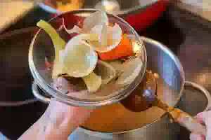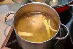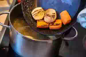 3. Примерно за 20 минут до окончания варки бульона, переложить опаленные овощи в кастрюлю. Как только бульон начнет закипать, уменьшить огонь и варить примерно 20 минут.