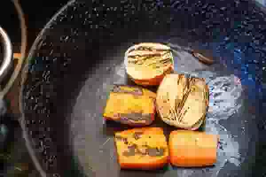 2. Одну луковицу и одну морковь вымыть. Морковь очистить, луковицу оставить в шелухе. Разрезать луковицу и морковь вдоль пополам. Положить срезом на сухую (без масла) сковороду и припечь до черноты.
