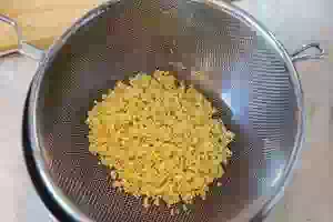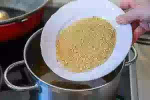5. Пока варится бульон, подготовить пшено. Крупу несколько раз промыть под проточной холодной водой, переложить в миску и залить горячей водой из чайника. Оставить на 10 минут, после чего слить воду и снова залить кипятком на 10 минут. Такая обработка пшенки убирает горечь. Пропаренное промытое пшено откинуть на сито и дать воде стечь.