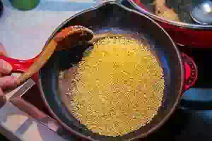 6. Переложить промытое обсушенное пшено на горячу.без масла сковороду и прогреть, помешивая ложкой. Продолжать обжаривать пшенку, пока не появится аромат поджаренной крупы. Жареное пшено пересыпать на тарелку.