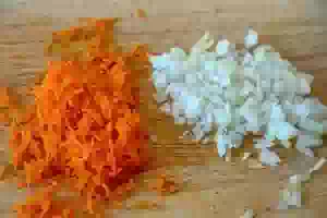 7. Оставшиеся лук и морковь вымыть, очистить и измельчить для овощной поджарки.