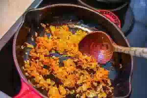 8. В сковороде разогреть 1 ст.л. растительного масла, добавить морковь с луком и пассеровать на слабом огне, помешивая овощи, пока они не станут мягкими. Переложить овощную пассеровку в кастрюлю с супом.