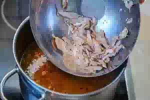 4. После этого морковку с луком, стебли сельдерея выловить и выбросить. Суп посолить по вкусу Из бульона выловить мясо, отделить его от костей и оставить в миске. Вареное мясо вернем в кастрюлю в конце приготовления супа.
