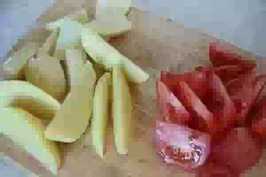 3. Пока варится мясо, подготовить овощи для супа. Картофель очистить и нарезать крупными дольками. Примерно так же нарезать спелые сочные помидоры.