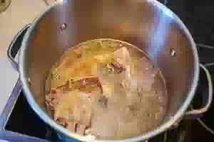 2. Баранину переложить кастрюлю, залить 2.5-3 л холодной воды и поставить на небольшой огонь. Как только вода начнет закипать, снизить нагрев до минимального и варить 1.5-2 часа, снимая образующуюся пену. Когда пена перестанет образовываться, добавить лавровый лист, сушеный чабер или тимьян.