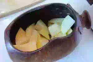4. В глиняный горшок (один большой или несколько порционных) положить нарезанный дольками картофель.