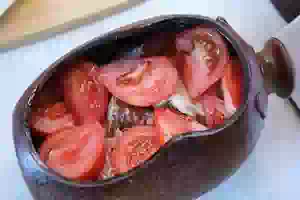 7. На мясо уложить слой помидоров. Все слои слегка посолить и приправить молотым черным перцем.