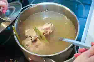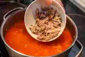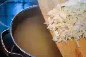 1. Сварить бульон для щей. Мясо на косточке вымыть, положить в кастрюлю, залить холодной водой. Как только вода начнет закипать, уменьшить огонь и варить, снимая шумовкой пену. На это уйдет около 2 часов. Для аромата в бульон можно добавить несколько стеблей укропа. Достать мясо из бульона, отделить от костей, мелко нарезать и на время отставить в сторону. Бульон посолить.