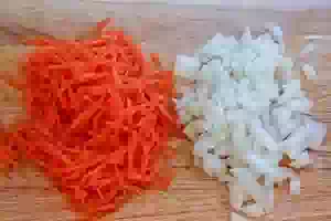 2. Пока варится бульон, подготовить овощи. Лук мелко нарезать. Очищенную морковь измельчить на крупной терке. Картофель нарезать маленькими кубиками.