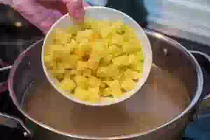 5. В кипящий бульон отправить картофель. Варить на слабом огне около 10 минут.
