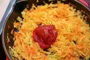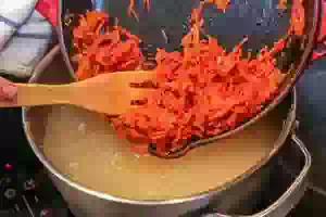7. Для овощной пассеровки в глубокой сковороде разогреть растительное масло и пассеровать все овощи вместе - лук, морковь, зеленую редьку, помешивая, чтобы не пригорали. Добавить к ним томатную пасту, влить немного бульона из кастрюли и тушить на слабом огне 2-3 минуты.