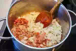 3. Нарезанный бекон переложить в кастрюле и обжаривать на среднем огне до хрустящего состояния. Половину жареного бекона переложить на тарелку и отставить в сторону. Добавить к бекону в кастрюлю лук и готовить, помешивая, примерно 5 минут или пока лук не станет мягким.