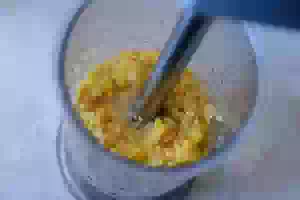 5. Консервированную кукурузу пересыпать в миску и измельчить до пюре (можно вместе с жидкостью).
