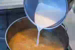 8. Отдельно разогреть сливки в сотейнике, но не кипятить. Перелить сливку в суп, снять с огня и размешать.