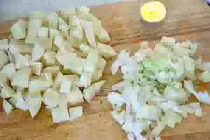 1. Подготовить все продукты для супа. Картофель вымыть, почистить и нарезать небольшими кубиками. Репчатый лук мелко нарезать. Сыр натереть на мелкой терке.