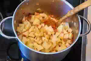 4. Следом отправить нарезанный картофель. Готовить, помешивая, 1-2 минуты.