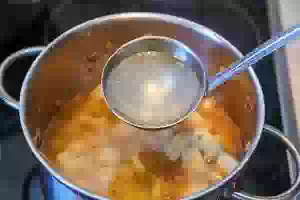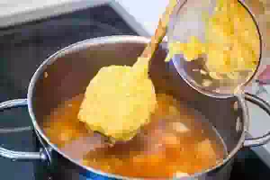 7. и добавить кукурузное пюре. Размешать, приправить по вкусу солью и довести до кипения. Как только бульон закипи, уменьшить огонь, прикрыть кастрюлю крышкой и готовить, помешивая, на маленьком огне 15-20 минут или пока картофель не дойдет до готовности и слегка разварится.