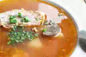 3. Бульон на 3-ей воде закипятить. Положить в него картофель кубиками, затем промытый рис (0.5 стакана на 2 литра), влить томатную заправку и варить харчо до готовности.