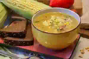 Гороховый суп с кукурузой, беконом и копченой индейкой