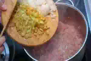 10. В почти готовый суп переложить пробитую в блендере кукурузу. Снова дождаться, когда суп начнет закипать на слабом огне, и варить примерно 10-15 минут, чтобы и кукуруза дошла до полной готовности.