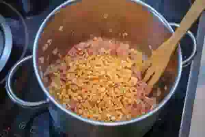 5. В кастрюле разогреть 1-2 ст.л. растительного масла и добавить копчености. Быстро обжарить, помешивая лопаткой, и пересыпать в кастрюлю сладкий перец с луком. Продолжать готовить, помешивая, пока овощи не станут мягкими и немного подрумянятся.