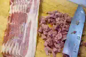 3. Филе копченой индейки и подкопченный бекон нарезать маленькими кубиками.