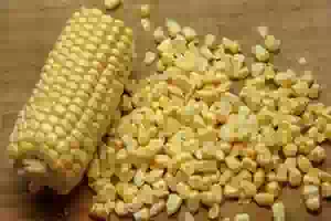1. Початок кукурузу очистить от листьев и рылец (волосков), срезать ножом или пальцами отколупать зерна с початка, сложить их в чашу блендера и немного пробить, не доводя до пюреобразной массы.