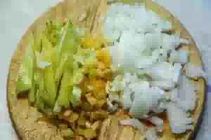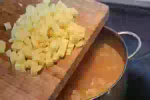 4. Подготовить остальные овощи для супа. Репчатый лук мелко нарезать. Сладкий перец вымыть, разрезать сначала пополам и вычистить семена, после каждую половинку нарезать полосками, а полоски - маленькими кубиками. Картофель очистить, нарезать кубиками.