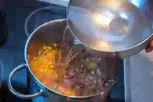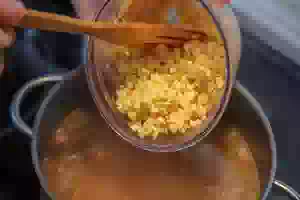 10. В почти готовый суп переложить пробитую в блендере кукурузу. Снова дождаться, когда суп начнет закипать на слабом огне, и варить примерно 10-15 минут, чтобы и кукуруза дошла до полной готовности.
