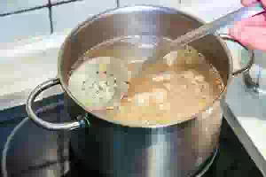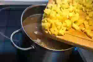 4. Засыпать картошку в бульон. Варить на слабом огне 20 минут после закипания супа.