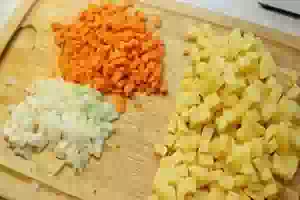2. Овощи вымыть и очистить. Картофель очистить и нарезать кубиками. Мелко нарезать морковь и лук.