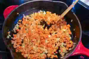 5. В сковороде разогреть 2 ст.л. растительного масла, добавить лук с морковью. Овощи пассеровать до мягкости, часто помешивая.