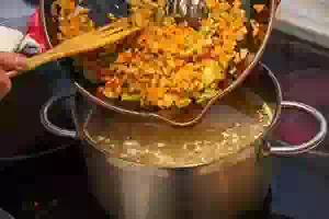 7. Переложить овощную пассеровку с солеными огурцами в суп.