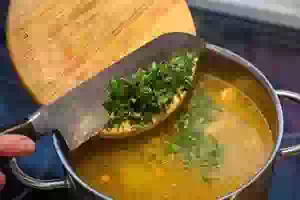 8. Следом отправить туда же рубленую свежую зелень. Посолить, если супу не хватает соли, довести до кипения и снять кастрюлю с плиты. Суп из свиных ребрышек с солеными огурцами готов. Разлить его по тарелкам, добавить в каждую порцию по ложке сметаны и подавать на стол.