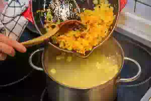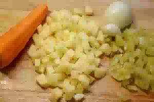 1. Подготовить овощи для супа. Картофель очистить, нарезать маленькими кубиками. Лук мелко порубить. Сладкий перец нарезать примерно так же мелко, как картофель. Очищенную морковь натереть на крупной терке или порезать кубиками. Довести воду до кипения, посолить и засыпать нарезанный картофель. Как только вода повторно закипит, уменьшить огонь и варить примерно 10 минут.