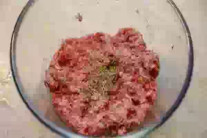 4. Для фрикаделек смешанный фарш из свинины с говядиной посолить, приправить специями (у меня хмели сунели), хорошо вымесить. Яйцо в фарш добавлять не надо.