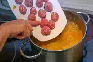6. Когда картофель в супе сварится, переложить в кастрюлю фрикадельки и варить их на небольшом огне, пока не всплывут.