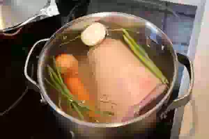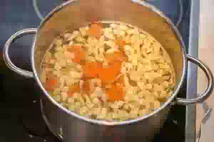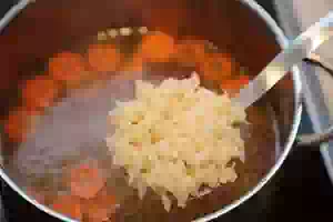1. Сварить мясной бульон. Для этого мясо на косточке (это может быть говядина, свинина, курятина и т.д.) вымыть под проточной водой, положить в кастрюлю с холодной водой. Туда же отправить целую очищенную морковь, луковицу, горошины перца и зелень. Поставить кастрюлю на средний огонь и как только вода начнет закипать, уменьшить огонь до минимального. Варить бульон, снимая шумовкой пену, не менее 2 часов. Посолить бульон, когда пена перестанет образовываться. Из бульона убрать зелень, мясо (его можно использовать для другого блюда или отделить от кости, нарезать на кусочки и вернуть в кастрюлю с бульоном). Луковицу и зелень выбросить, а морковку можно нарезать кружочками.