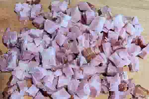 3. Ветчину режем кубиками, обжариваем на сковороде с небольшим количеством растительного масла и перекладываем к овощам. Соединяем все ингредиенты вместе. Испанский суп ветчиной и зеленым горошком готов.