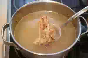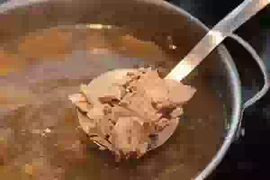 1. Сварить мясной бульон. Овощи вымыть и очистить. Свинину на косточке вымыть, положить в кастрюлю с холодной водой. Туда же отправить целую луковицу и морковь. Поставить кастрюлю на плиту, и как только вода начнет закипать, снизить нагрев и варить, снимая пену около 2 часов. Когда пена перестанет образовываться, посолить и поперчить бульон. Через 2 часа выбросить из супа лук и морковь. Достать из бульона мясо, отделить от костей. Кости выбросить, мякоть на время отложить в сторону.