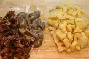 2. Грибы разморозить, если надо, порезать помельче. Картофель очистить и нарезать кубиками.
