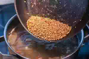 6. Пересыпать обжаренную гречку в кастрюлю с супом. Проварить примерно 5 минут на небольшом огне. Гречка к этому моменту будет практически готова.