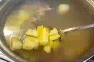 2. В этом время картофель очистить, нарезать крупными кусочками. Добавить картофель в мясной бульон и варить примерно 10 минут.