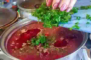 8. За 10 минут до готовности, добавить в суп по вкусу лимонный сок, положить перец горошком. Готовый свекольник на свиных ребрышках со свекольной ботвой подавать к столу горячим с майонезом или сметаной.