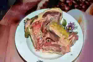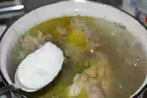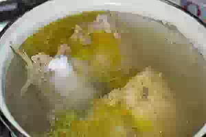 2. В кастрюлю влить воду, положить мясо и варить примерно, 40 минут на слабом огне после закипания. Готовность определить ножом либо вилкой. Нужно чтобы волокна мяса хорошо отделялись от костей и кожицы.