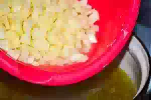 4. Картофель почистить, измельчить кубиками. Переложить нарезанный картофель в кастрюлю.