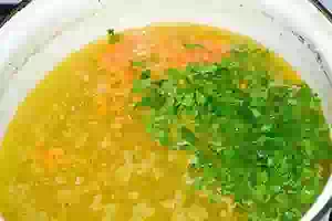 5. Отправить сразу же в кипящий бульон измельченную морковь, лавровый лист и рубленую петрушку. Варить 5 минут после закипания.