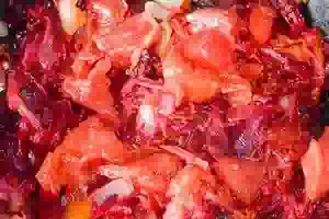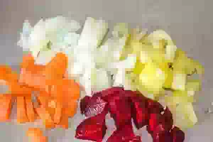 2. Пока варится утка для борща, нужно сделать заправку. Нарезать для неё некрупными кусочками очищенные свеклу, лук, морковку и перец.