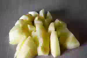 4. Из готового бульона вынуть куски утки, мясо отделить от косточек, положить его снова в кастрюлю. Картофель очистить, нарезать на кусочки. Отправить их в бульон. Дождаться закипания и варить 10 минут.