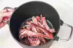 1. Залить холодной водой косточки и кусочки мяса копченого гуся, довести до кипения, уменьшить огонь и варить, снимая пену, около 30 минут. Снять мясо с костей, положить его в бульон, а кости выбросить.